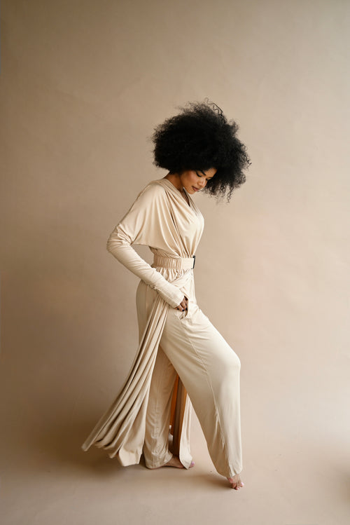 A signature piece from the Shadow Muse collection, designed for fluid layering and quiet movement. The Almond tone brings a soft, natural warmth that enhances the fluidity of the silhouette, creating a calm and refined presence. The silhouette falls naturally along the body, forming gentle drapes that move with ease. The hood adds depth, while the overall structure remains light and unrestrictive.